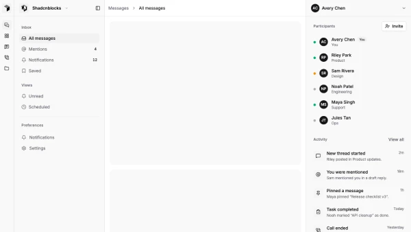 Shadcn app blocks are purpose-built sections for web applications, dashboards, and SaaS products. These shadcn UI application components cover common patterns for authenticated user experiences, data management, and productivity tools.